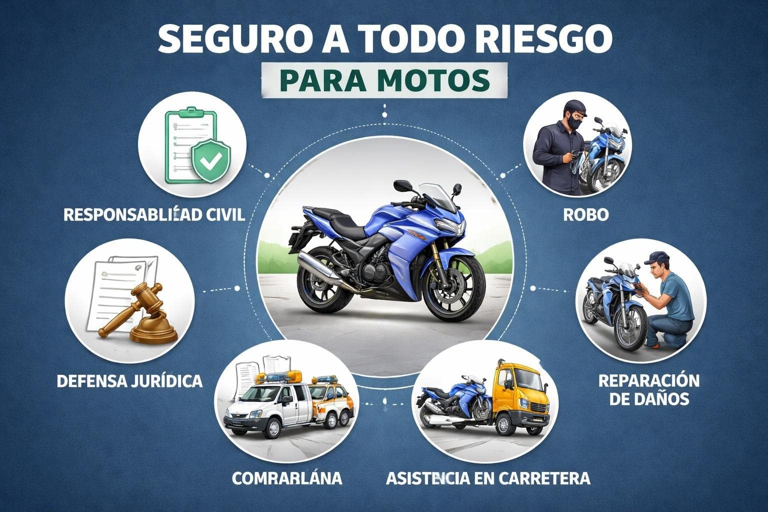 Representa la protección más completa disponible para seguros moto de campo. Incluye todas las coberturas anteriores más la reparación de daños propios independientemente de quién sea el responsable del accidente.